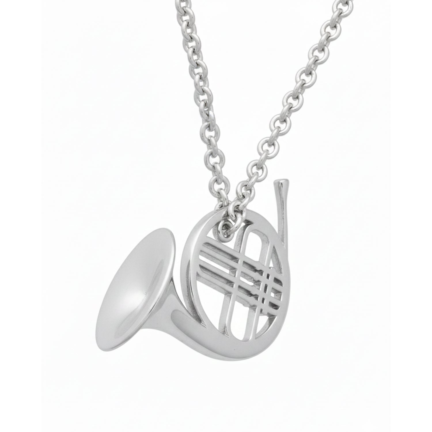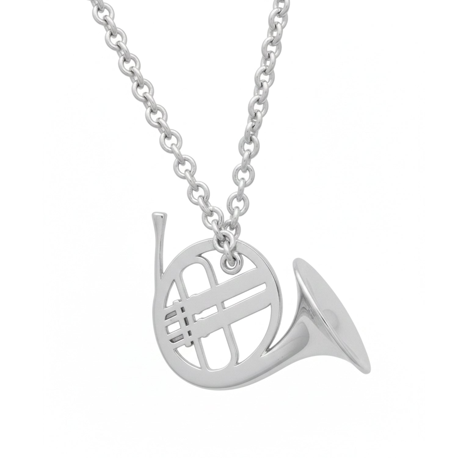 This charming pendant is an essential accessory for French horn players, music students, band members, or anyone who appreciates the majestic, warm sound of brass instruments. The unique French horn design captures the instrument's iconic coiled shape and flared bell in a flat, detailed, and elegant outline.