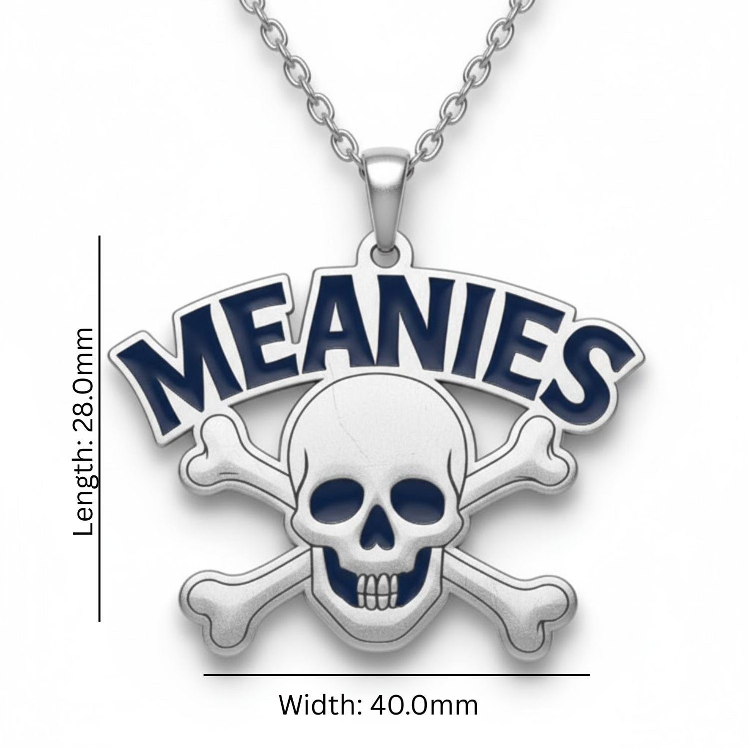 This edgy piece features the classic pirate symbol—a stark skull and crossed bones—boldly topped with the arched word "MEANIES" set in a rich, contrasting dark blue enamel. It's the perfect statement accessory for those who dare to stand out.