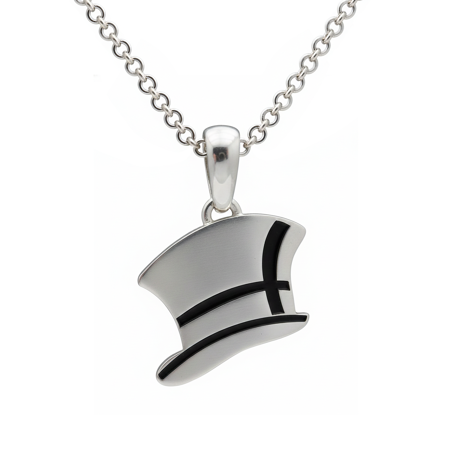 This stylish pendant features a sleek, modern interpretation of a top hat, the hat’s playful, curved silhouette is accented with bold black enamel lines, adding definition and an elegant contrast that highlights its iconic shape. Smooth surfaces and refined contours give the piece a sophisticated finish, making it both eye-catching and timeless.